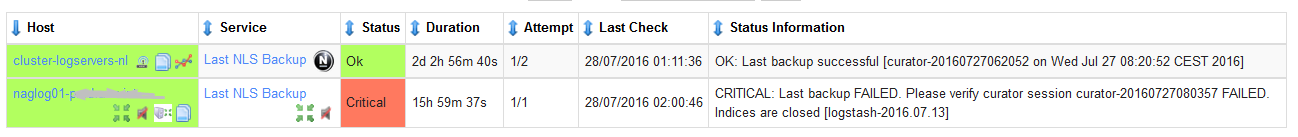 The most recent Elasticsearch/Nagios Log Server index backup result is examined and its state (Full, Partial, Failed) corresponds to a Nagios status (Critical,warning,OK). State "Unknown" is used should the maximum snapshot age (configurable in the script) exceed the most recent backup end time.