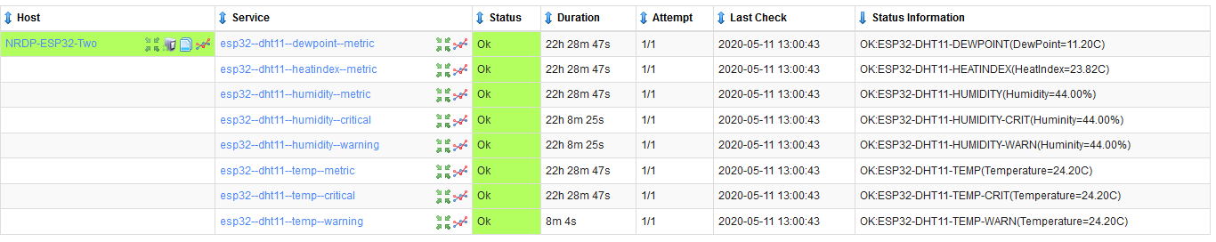 Send DHT11 sensor data to NagiosXI wihtout evaluation via NRDP. Temperature (C) Humidity (%) DewPoint (C) HeatIndex (C)