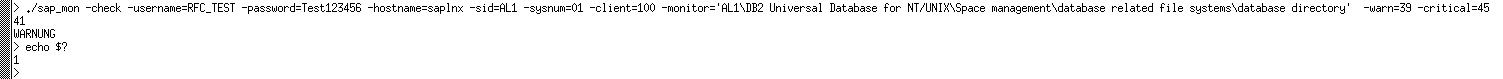 ./sap_mon -check -username=RFC_TEST -password=Test123456 -hostname=saplnx -sid=AL1 -sysnum=01 -client=100 -monitor='AL1DB2 Universal Database for NT/UNIXSpace managementdatabase related file systemsdatabase directory'