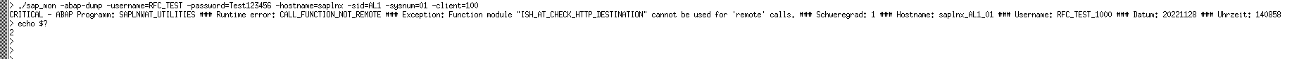 ./sap_mon -abap-dump -username=RFC_TEST -password=Test123456 -hostname=saplnx -sid=AL1 -sysnum=01 -client=100
