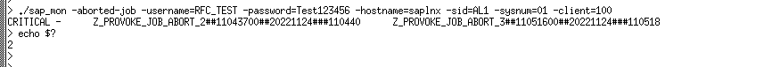./sap_mon -aborted-job -username=RFC_TEST -password=Test123456 -hostname=saplnx -sid=AL1 -sysnum=01 -client=100