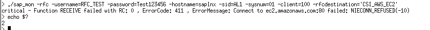 ./sap_mon -check -username=RFC_TEST -password=Test123456 -hostname=saplnx -sid=AL1 -sysnum=01 -client=100 -monitor='AL1saplnx_AL1_01R3SyslogCommunication'
