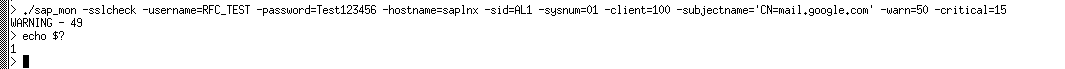 ./sap_mon -sslcheck -username=RFC_TEST -password=Test123456 -hostname=saplnx -sid=AL1 -sysnum=01 -client=100 -subjectname='C=DE, O=SAP Trust Community, OU=SAP Web AS, OU=I0020785703, CN=saplnx.moore.corp' -warn=30 -critical=15