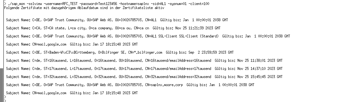 ./sap_mon -sslview -username=RFC_TEST -password=Test123456 -hostname=saplnx -sid=AL1 -sysnum=01 -client=100