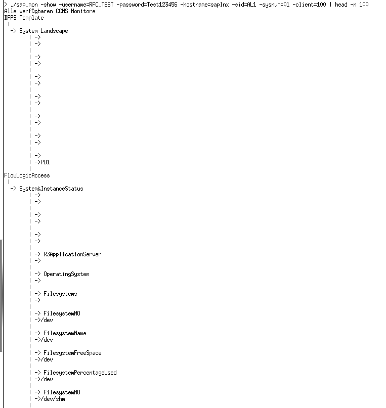 ./sap_mon -show -username=RFC_TEST -password=Test123456 -hostname=saplnx -sid=AL1 -sysnum=01 -client=100