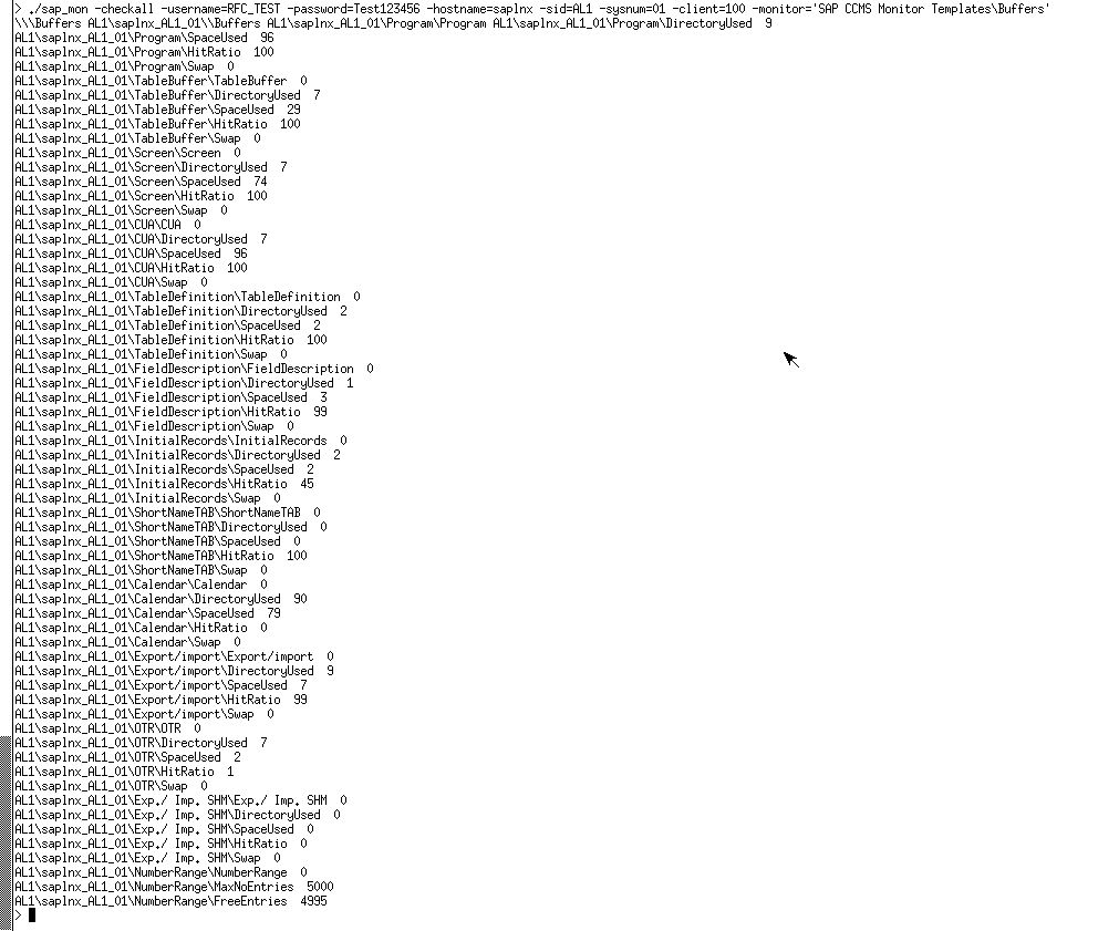 ./sap_mon -checkall -username=RFC_TEST -password=Test123456 -hostname=saplnx -sid=AL1 -sysnum=01 -client=100 -monitor='SAP CCMS Monitor TemplatesBuffers'